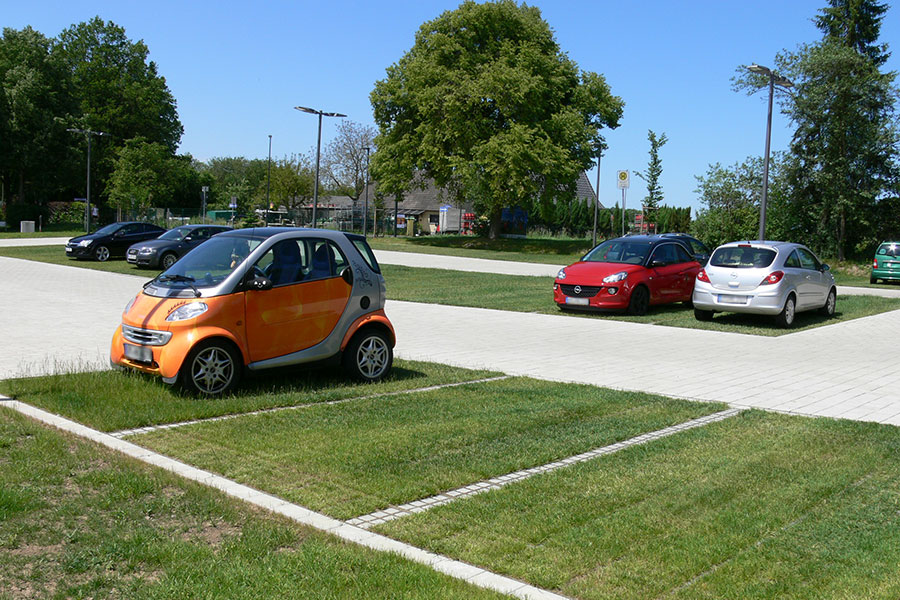 Für den Parkplatz am Rathaus einer Kommune wurde eine unversiegelte TTE® Fläche ausgeführt. Das Niederschlagswasser versickert direkt über den Flächenaufbau. Eine zusätzliche zentrale Rigole war nicht erforderlich – die Fläche bleibt voll nutzbar als Parkplatz.